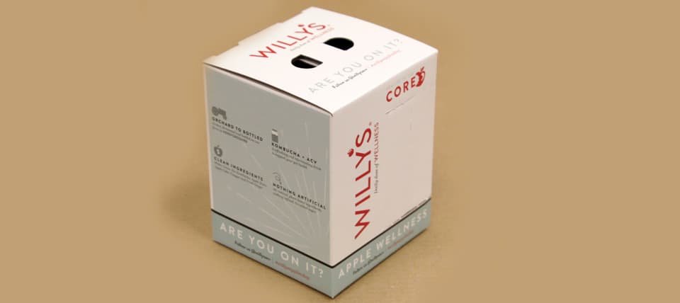 Willy’s was launching a new product, a sparkling Kombucha and ACV drink. They were looking for on-shelf display packaging which would stand out from the crowd. The box also needed to be easy to carry and strong enough to take the weight of 4 x 250ml cans.