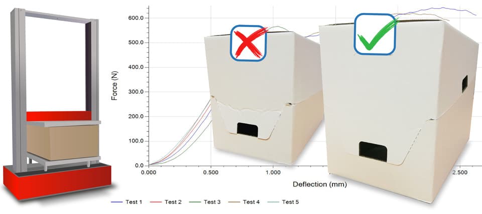 The Weedon Group invested in new testing equipment early in 2020, and its testing laboratory is able to undertake edge testing of corrugated board, as well as to test its compression strength (how much load the board can withstand before it collapses), its weight and its burst strength (how much pressure it can tolerate before it fails).