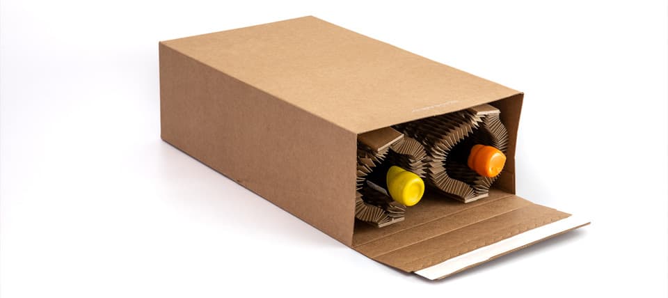 Bottles are first wrapped in a Flexi-Hex sleeve which expands to form an impact-resistant protective honeycomb layer around the bottle. This is then inserted into a self-sealing pinch-top postal box, designed and manufactured by the Weedon Group, which protects the bottle by suspending and preventing movement during transportation.